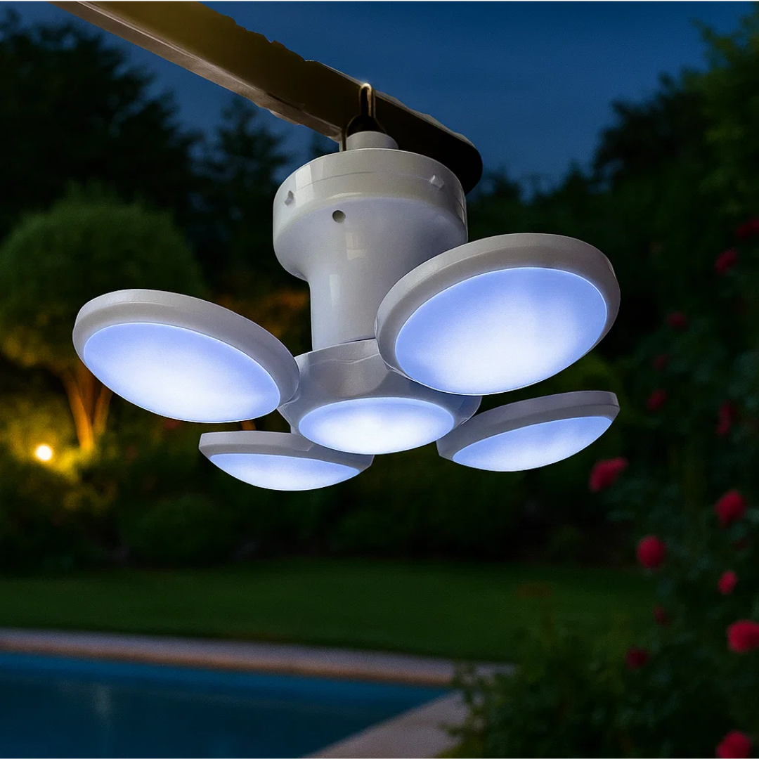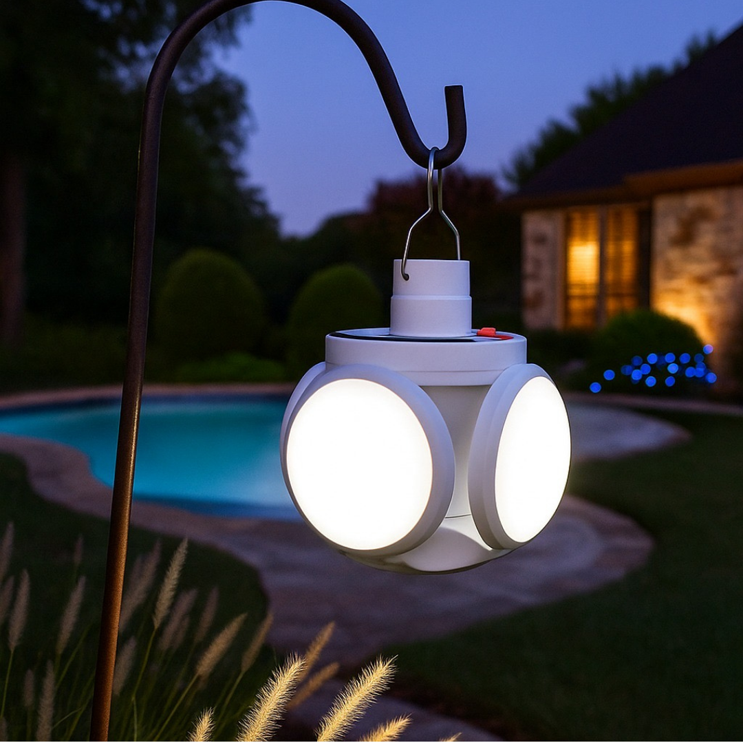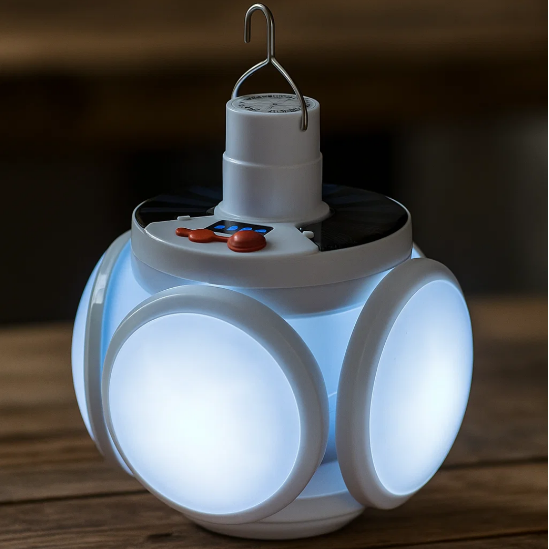 Nuestra lámpara solar cuenta con un diseño innovador y flexible que se abre en forma de trébol, proporcionando cinco bombillos para una iluminación más amplia. A pesar de su tamaño compacto, al expandirse, ilumina de manera eficiente áreas más grandes como jardines, patios o terrazas, brindando gran visibilidad con una iluminación potente.