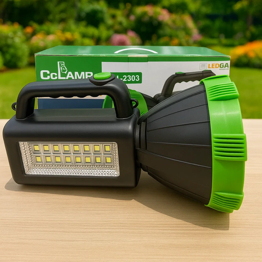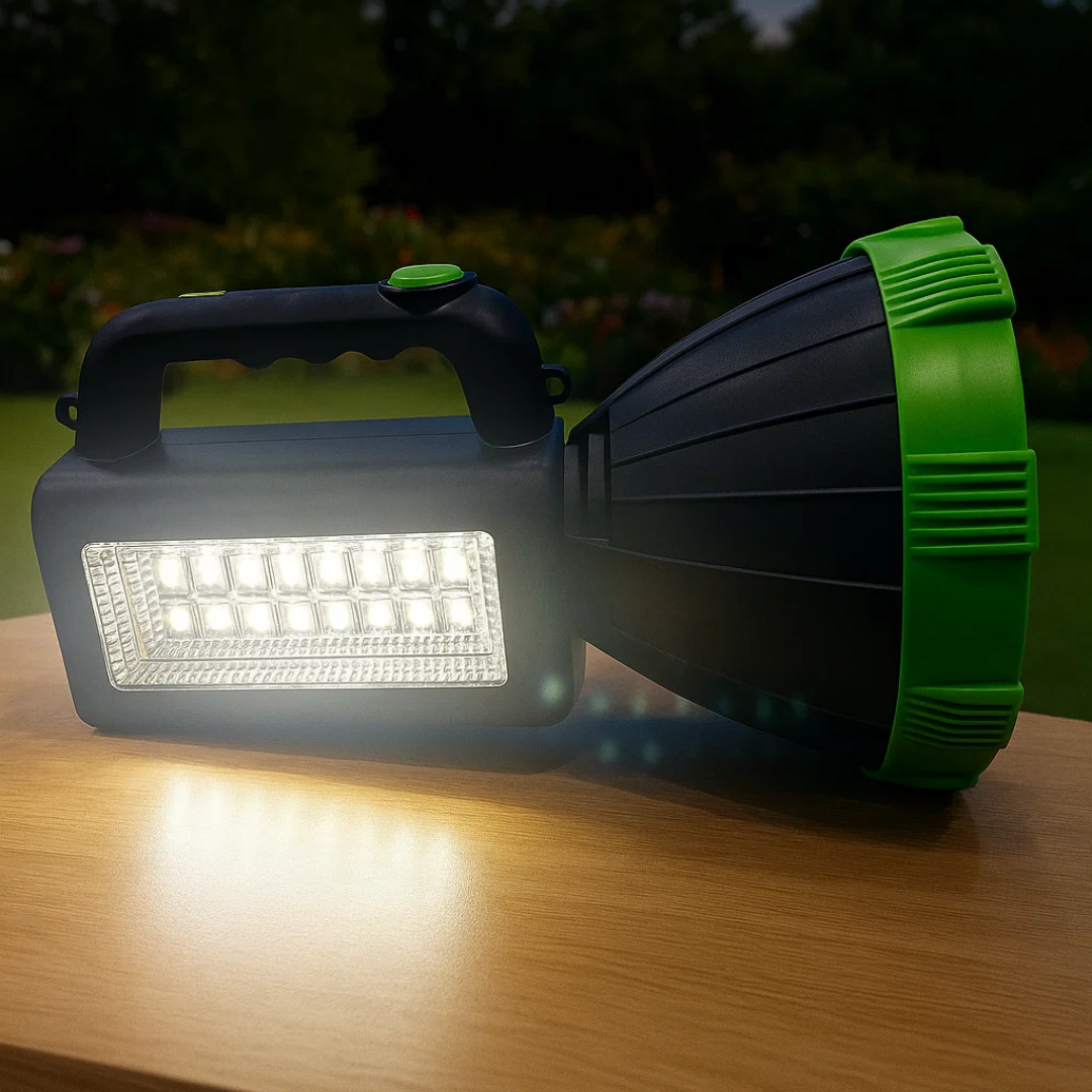 No es solo una linterna, es un combo de iluminación total. Gracias a su reflector frontal, podrás iluminar espacios amplios con gran intensidad, perfecto para patios, garajes o cortes de energía. Disfruta de una luz uniforme y potente, diseñada para cubrir más área y hacer tu experiencia mucho más práctica y cómoda.