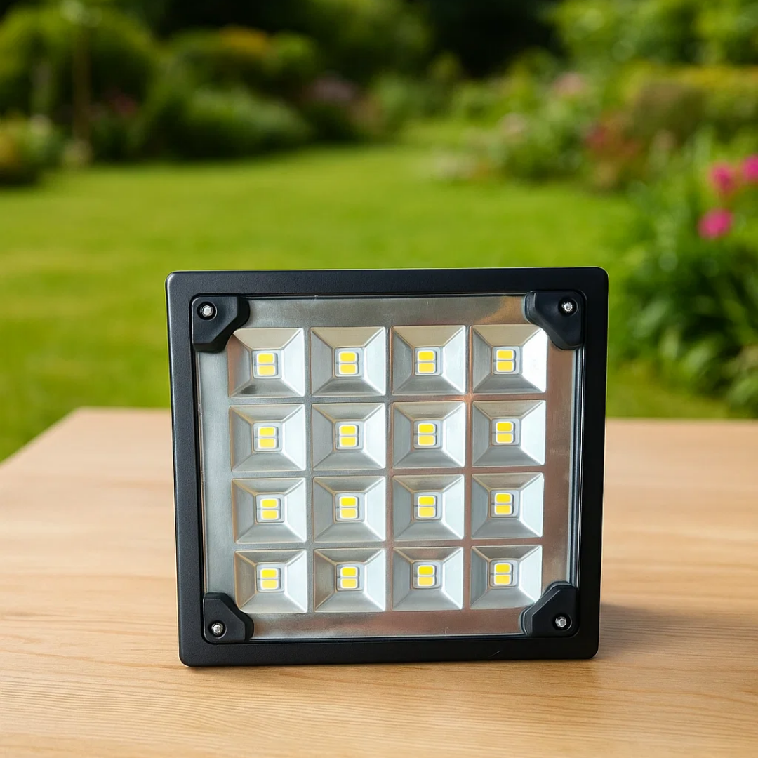 Este reflector solar ilumina grandes espacios con luz intensa y constante. Ideal para patios, terrazas, entradas o áreas de trabajo. Funciona con energía solar, así que no necesitas cables ni electricidad: solo la luz del sol.